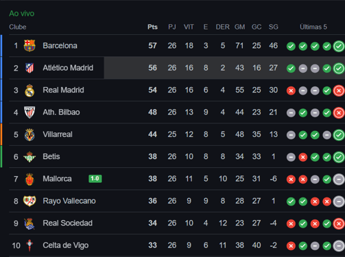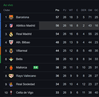 Com o triunfo, os blaugranas alcançaram 57 pontos, ficando um ponto à frente do Atlético e consolidando a liderança isolada da competição. Enquanto isso, o Real Madrid, que perdeu para o Betis por 2 a 1 no sábado, caiu para a terceira posição.